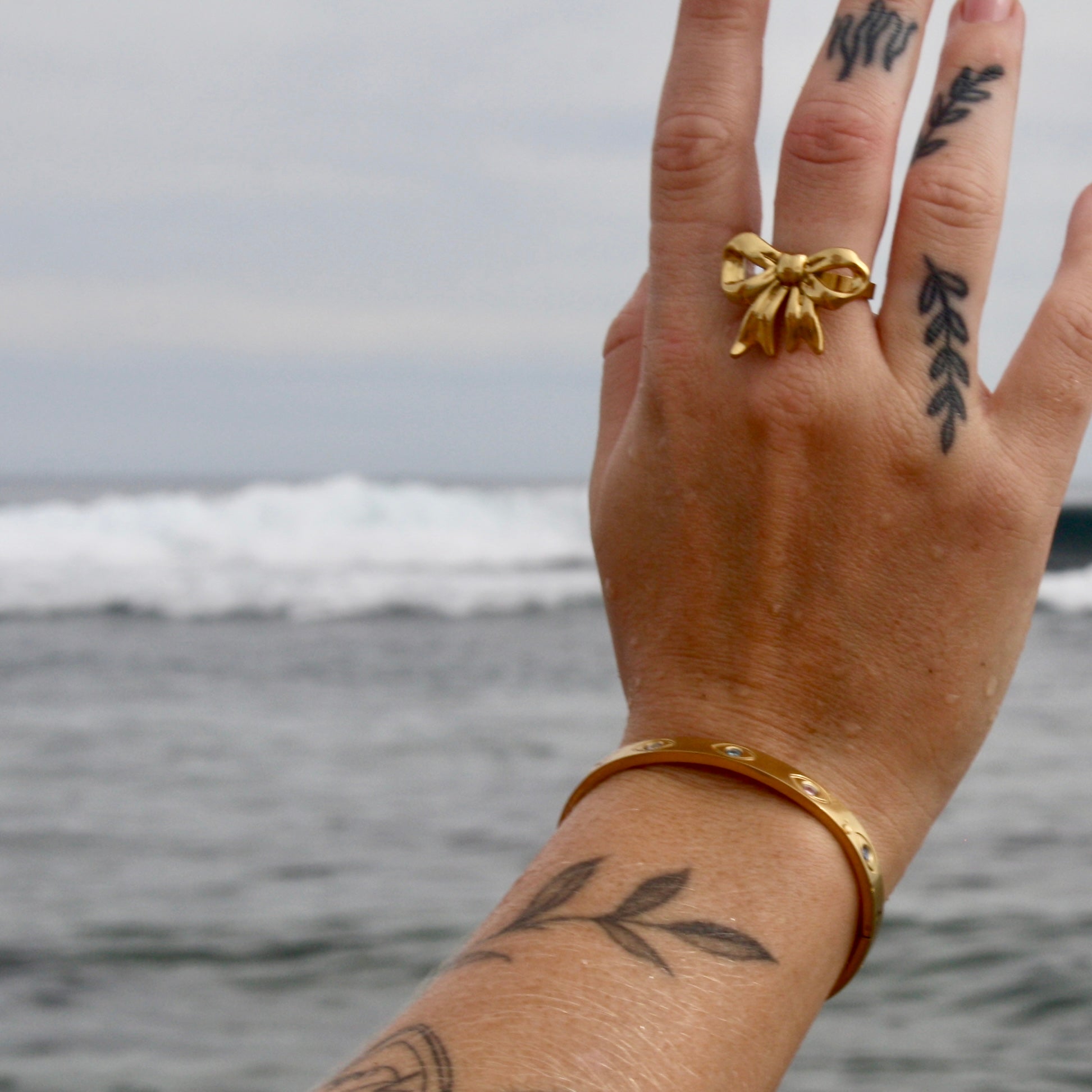 18k gold plated on brass and stainless steel. Water resistant and environmentally friendly.Anti-allergetic and nickle-free.